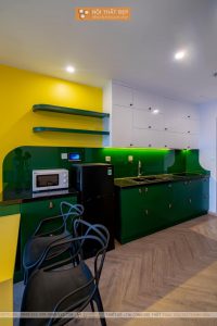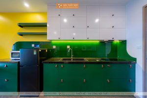 Hệ tủ bếp trên đụng trần, tủ bếp dưới mang tone màu xanh rêu độc đáo và lạ mắt